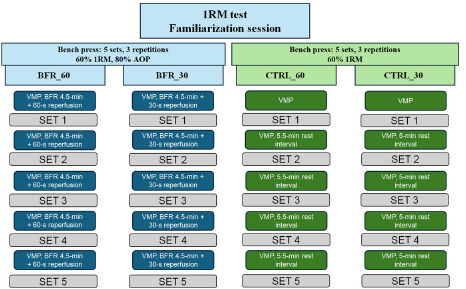 BFR_60: BFR condition (4.5-min BFR + 60-s reperfusion); BFR_30: BFR condition (4.5-min BFR + 30-s reperfusion); CTRL_60: control condition (5.5-min rest interval); CTRL_30: control condition (5-min rest interval); VMP: viscoelastic muscle properties measurements; 1RM: one repetition maximum; AOP: arterial occlusion pressure