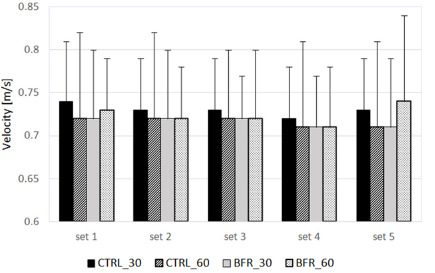 Mean bar velocity (m/s) during each set of the bench press exercise under experimental conditions. CTRL_30: control condition (5-min rest interval); CTRL_60: control condition (5.5-min rest interval); BFR_30: BFR condition (4.5-min BFR + 30-s reperfusion); BFR_60: BFR condition (4.5-min BFR + 60-s reperfusion)