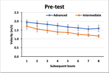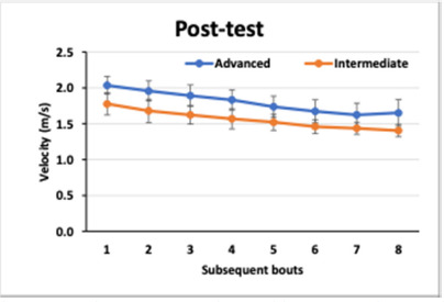 The normality of the data distribution was assessed using the Shapiro-Wilk test. The results indicated that the data followed a normal distribution. An analysis of variance for repeated measures was conducted to compare velocities, taking a group as a fixed factor (GROUP: Intermediate, Advanced), and time (TIME: pre- test, post-test) along with a lap (LAP: 1 to 8) as repeated factors. PIs were compared using ANOVA involving GROUP and TIME. The Levene’s test was utilised in order to assess the homogeneity of variance within the sample. The Tukey test was used for post-hoc comparisons. A paired t-test for independent groups was applied to determine differences in age, body mass, and training experience. Pearson correlation analyses were used to examine the relationship between the decrement score and the PI. The results were analysed using Jamovi version 2.3.21 software, with the significance level set at α = 0.05.