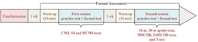 This was an observational study. The assessment procedures were conducted as shown in Figure 1. One week before the formal assessment, all participants underwent a familiarization session with the assessment protocol at testing sites. The formal assessment consisted of two sessions. The first session evaluated BLD through three types of jumping tests (CMJ, SJ and HCMJ) under both bilateral and unilateral conditions, and the second session determined linear sprint (10 m and 20 m) and COD (505COD test, 5105COD test, and T-test) performance one week after the first session. During each session, participants began with a 10-min warm-up (5-min jogging and 5-min bodyweight resistance exercises); passive stretching was avoided for impacting the outcomes of physical performance (Knudson et al., 2001). Afterwards, 2–3 practice attempts (at 50–75% of each participant’s maximal effort) for each test were performed, and then the formal test was conducted with two trials. All variables were recorded and calculated as the average values of the two trials for subsequent analysis (Meylan et al., 2010b).