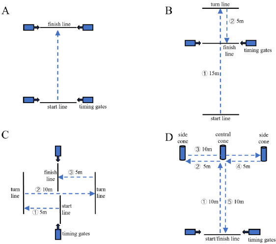 Schematic representation of linear sprint and change of direction (COD) tests. (A) Linear sprint (5 m and 10 m) test; (B) 505 COD test; (C) 5105 COD test; (D) T-Test.