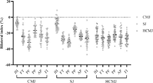 Lower limb BLD assessments were performed on a triaxial force plate (AMTI, USA), and the force data were recorded at a sampling rate of 1000 Hz. Mathematical software (Matlab, USA) was utilized to calculate JH (during CMJ and SJ), jump distance (JD, during HCMJ), flight time (FT), peak force (PF), peak power (PP), average power (AP) and the FI during jump tests, according to the protocols in previous studies (Meylan et al., 2010a, 2010b). The outcomes of BLD (represented by the bilateral index, BI) were calculated using the following formula: