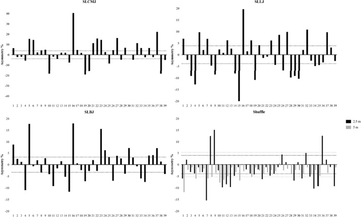 Individual inter-limb asymmetry data for jump height and shuffle speed. Above 0 means the asymmetry favors the right limb or direction, and below 0 means asymmetry favors the left limb or direction. Dotted lines represent the group threshold calculated from the pooled CV of the right and left limbs or direction test scores (SLCMJ = 3.85%, SLLJ = 3.85%, SLBJ = 3.25%, S2.5 = 3.95%, S5 = 5.25%).