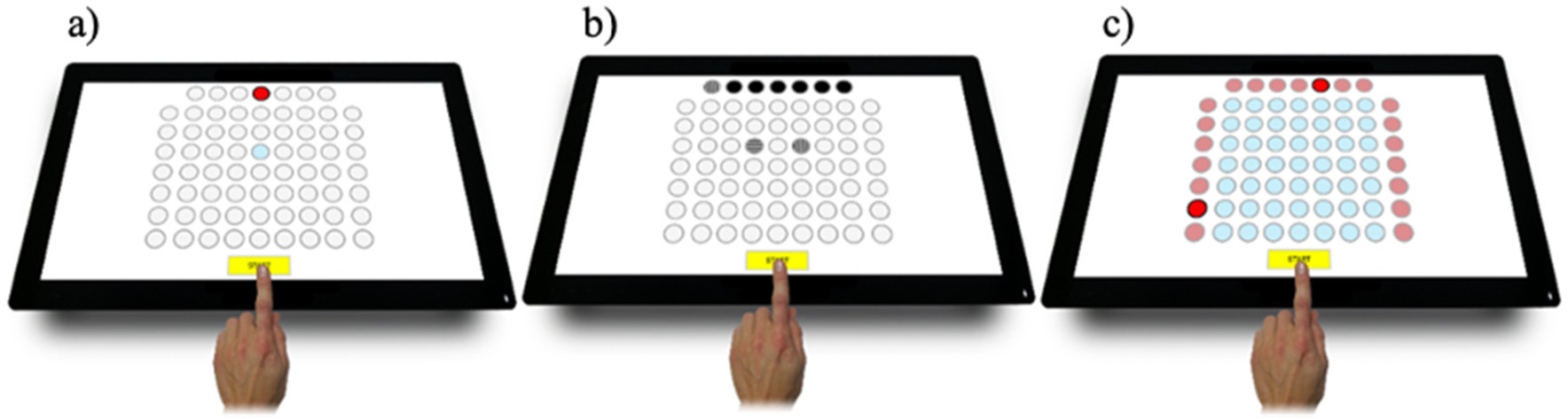 Psychomotor abilities were evaluated using the Test2Drive system (ALTA, Siemianowice Śląskie, Poland) (Tarnowski, 2014). Three tests were performed to measure the psychomotor abilities: (a) a simple reaction time test (SIRT), (b) a choice reaction time test (CHORT), and (c) a spatial anticipation test (SPANT). The SIRT assessed reaction speed and its stability. The stimuli signaling field changed their color at precise intervals. Participants responded to the stimuli by moving their fingers from the start button to the reaction time field marked in blue. The CHORT evaluated speed and reaction adequacy. In the top signaling row, horizontal benchmarks (stimuli requiring a reaction), vertical stimuli (also requiring a reaction), and a slant benchmark (neutral stimuli that did not require a reaction) were displayed. Participants responded to the stimuli by moving their finger from the start button to one of the two reaction fields (horizontal or vertical stimulus). During the neutral stimulus, participants kept their finger on the start button. The SPANT evaluated eye-hand coordination using spatial information. Signaling fields were positioned at the test board’s top, left, and right sides. Two fields (one in a row and one in a column) turned red simultaneously. Responding to the stimulus, participants indicated the field at the intersection of the lit row and column with their fingers and then returned to the start button. The panels illustrating the (a) SIRT, (b) CHORT, and (c) SPANT tests can be seen in Figure 1 in their respective order.