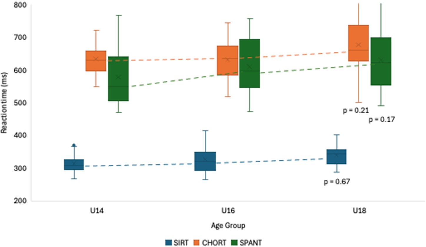 The comparison among the age groups (i.e., U14, U16, U18) regarding reaction time abilities is presented in Figure 2. According to the results, no statistically significant differences were seen between performances. However, the results did show a visible trend that U16 players performed better in terms of reaction time in the three tests: (i) SIRT (U14 = 333.3 ± 32.4; U16 = 325.6 ± 27.9; U18 = 327.5 ± 40.4), (ii) CHORT (U14 = 678.4 ± 69.8; U16 = 638.7 ± 47.9; U18 = 640.0 ± 75.4), (iii) SPANT (U14 = 633.7 ± 95.5; U16 = 583.6 ± 80.1; U18 = 618.1 ± 101.4).