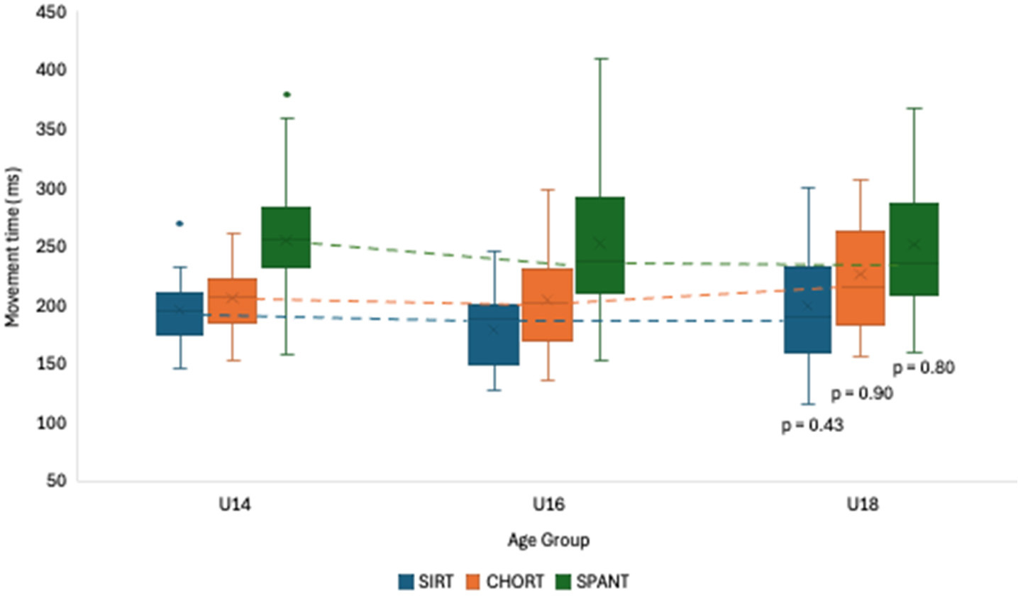 Figure 3 represents the comparison among particular age groups (i.e., U14, U16, U18) regarding movement time. The results showed no significant differences between age groups regarding movement time in the three tests. However, the U18 group showed a better performance in two out of the three tests: (i) SIRT (U14 = 194.6 ± 40.9; U16 = 194.0 ± 24.5; U18 = 186.8 ± 45.7), (ii) CHORT (U14 = 213.7 ± 38.2; U16 = 215.4 ± 57.4; U18 = 211.3 ± 46.7). Interestingly, in the SPANT it was the youngest group who performed better (U14 = 246.8 ± 55.6; U16 = 249.6 ± 50.1; U18 = 261.6 ± 66.5).
