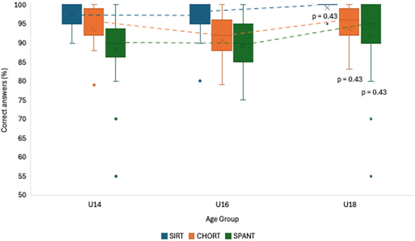 The comparison among the age groups (i.e., U14, U16, U18) in terms of the percentage of correct answers can be seen in Figure 4. According to the results, only the SPANT results showed significant differences among groups, with the U16 group outperforming the U14 and U18 groups by 4.5% and 6.4%, respectively (p = 0.01). Although there were no statistically significant differences in the remaining two tests, the results did show a visible trend that U18 players had the lowest percentages of correct answers in all three tests: (i) SIRT (U14 = 98.3 ± 2.9; U16 = 98.0 ± 4.4; U18 = 97.7 ± 3.2), (ii) CHORT (U14 = 92.5 ± 5.4; U16 = 93.9 ± 6.7; U18 = 91.4 ± 10.8), (iii) SPANT (U14 = 89.0 ± 11.9; U16 = 93.5 ± 5.5; U18 = 87.1 ± 9.2).