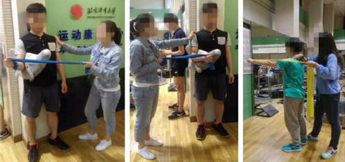 The elbows were flexed at 90°C, resisting the elastic band for external and internal rotation of the shoulder joint and maintaining the position for 15 s before returning to the starting position (Figure 2).