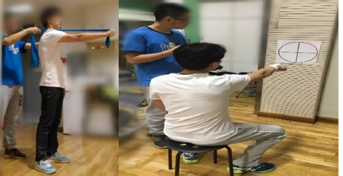Participants were seated one meter from the wall, extended forward at shoulder level with their palms down and fists closed, and a laser pointer was used on one hand to trace a circle on a target board, which was adjusted to align with the scapulo-humeral joint (Figure 3). Two sets were performed with 30-s rest intervals.