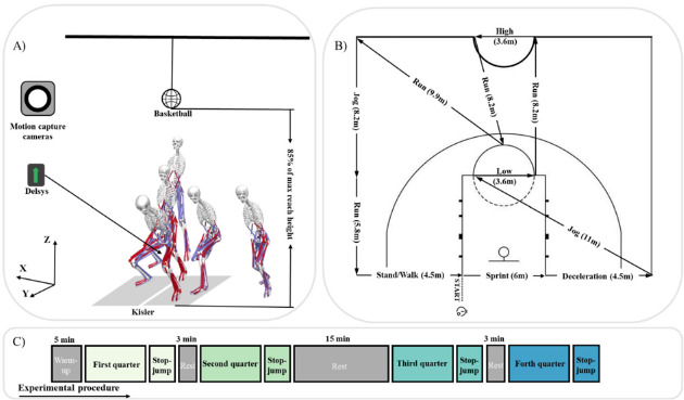 Participants began with a 5-min standard dynamic warm-up, which included low-intensity jogging, whole-body dynamic and static stretches, and brief bouts of high-intensity running (Scanlan et al., 2012). They then performed two maximal-effort stop-jumps, touching a height marker. The average height determined the target for the actual stop-jump test, set at 85% of this height. After setting the target height, the Basketball Exercise Simulation Test (BEST) was used to simulate basketball-specific activity and impose game-specific simulated basketball load on the participants. High-intensity, intermittent exercise protocols, such as those employed in this study, have been shown to induce acute and prolonged neuromuscular fatigue, making them valuable tools for biomechanical screenings under fatigued conditions (Vermeulen et al., 2024).