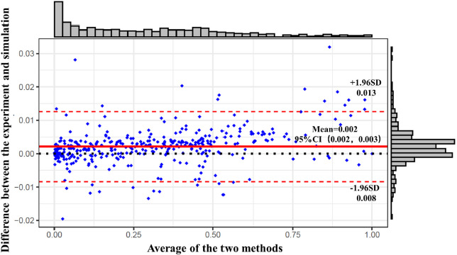 The EMG acquisition data and OpenSim simulation data were normalized and subjected to a consistency assessment. In the Bland-Altman plot, the data form a horizontal band indicated no linear or a nonlinear relationship between the differences and the means. The histogram on the right side of Figure 2 shows that the differences follow a normal distribution. The results in Figure 2 demonstrate that the majority of the data points fall within the limits of agreement, indicating good consistency between the two methods and validating the reliability of our model.