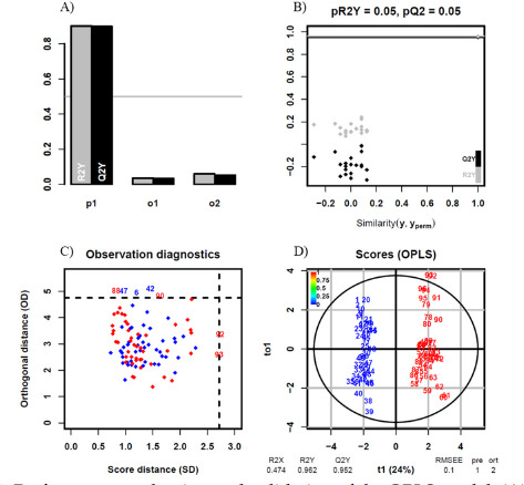 Performance evaluation and validation of the OPLS model; (A) model performance metrics; p1 indicates the model’s predictive component; o1 indicates the orthogonal component 1; o2 indicates the orthogonal component 2; (B) permutation test for model validation; (C) observation diagnostics; (D) scores plot from the OPLS model; blue indicates the ASYM group, and red indicates the CON group.