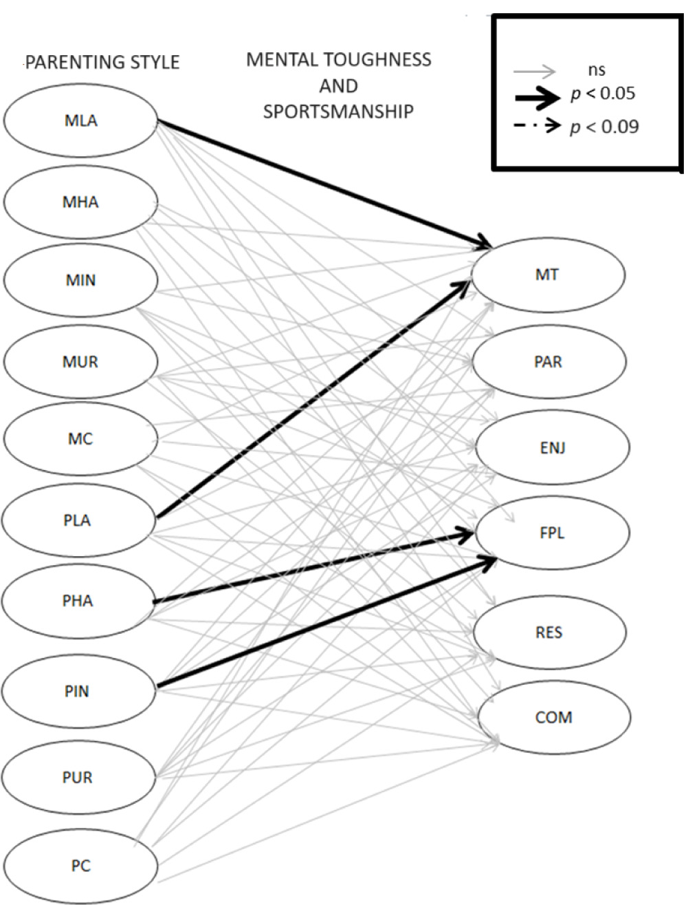 MLA, Maternal Love/Affection; MHA, Maternal Hostility/Aggression; MIN, Maternal Indifference/Neglect; MUR, Maternal Undifferentiated Rejection; MC, Maternal Control; PLA, Paternal Love/Affection; PHA, Paternal Hostility/Aggression; PIN, Paternal Indifference/Neglect; PUR, Paternal Undifferentiated Rejection; PC, Paternal Control; MT, Mental Toughness; PAR, Participation; ENJ, Enjoyment; FPL, Fair Play; RES, Respect; COM, Commitment.