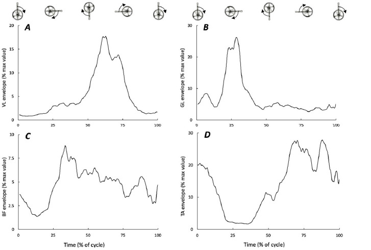 Typical root mean square (RMS) envelopes for the four muscles are in panels A (VL, vastus lateralis), B (GL, gastrocnemius lateralis), C (BF, biceps femoris), and D (TA, tibialis anterior). Envelopes were obtained by calculating the average RMS of the normalized cycle over 10 consecutive eccentric cycles. RMS values are given as % of the maximal values obtained during the whole downhill ride.