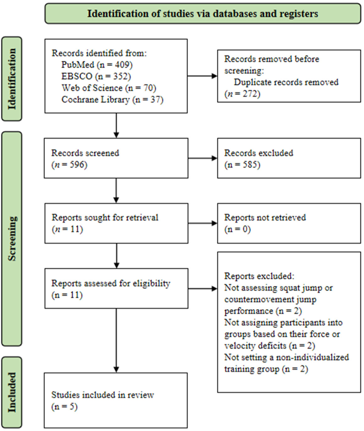 The initial database search yielded a total of 868 studies. After that, 272 studies were excluded due to duplication and additional 585 based on the title and abstract screening. Eleven studies were assessed for full-text eligibility, while 6 of them were excluded due to the lack of reporting jump height or because they did not divide subjects into subgroups based on their F-V imbalance (i.e., force-deficit, velocity-deficit and well-balanced subgroup) or no non-individualized training program was set. Finally, five studies were included in this systematic review (Figure 1).