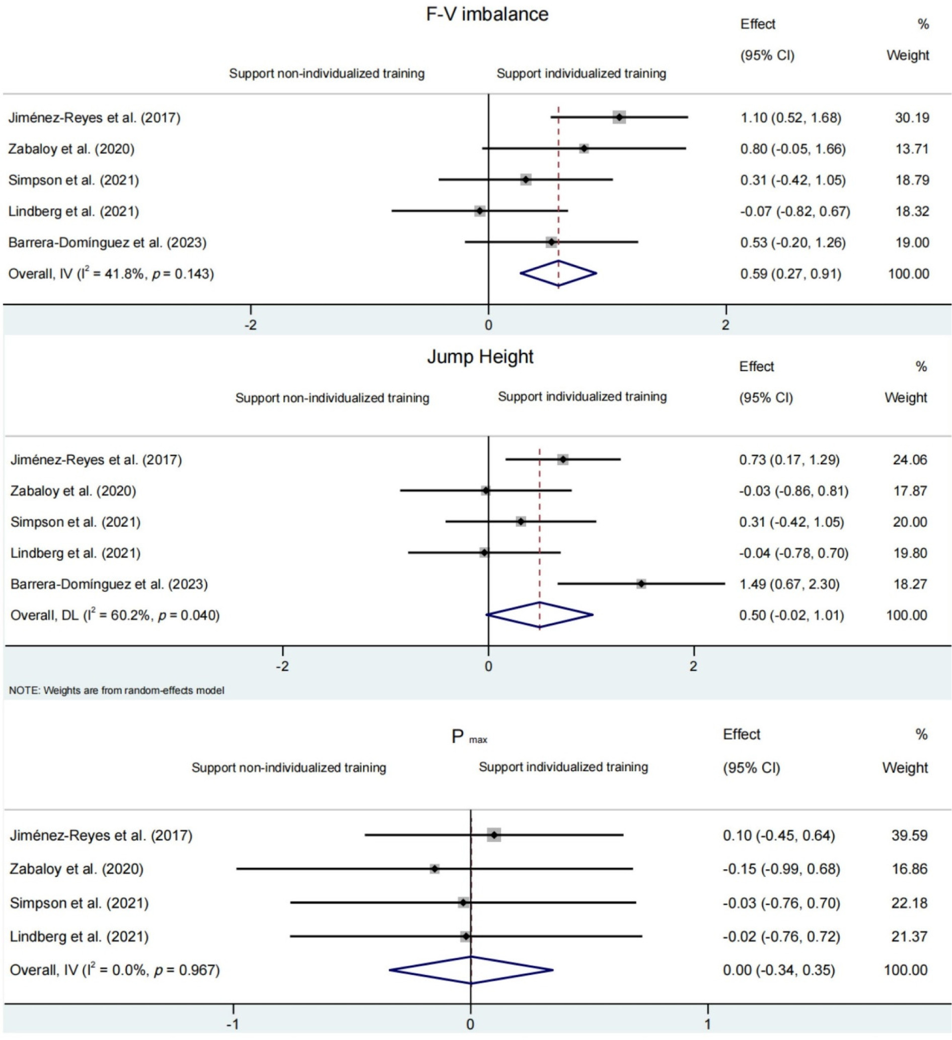 Comparison of changes in the force-velocity (F-V) imbalance (upper panel), jump height (middle panel), and maximal power (Pmax; lower panel) between individualized training programs (based on the force-velocity profile) and non-individualized training programs (not considering the F-V profile). The forest plot shows pooled standardized mean differences along with their 95% confidence intervals (CIs).