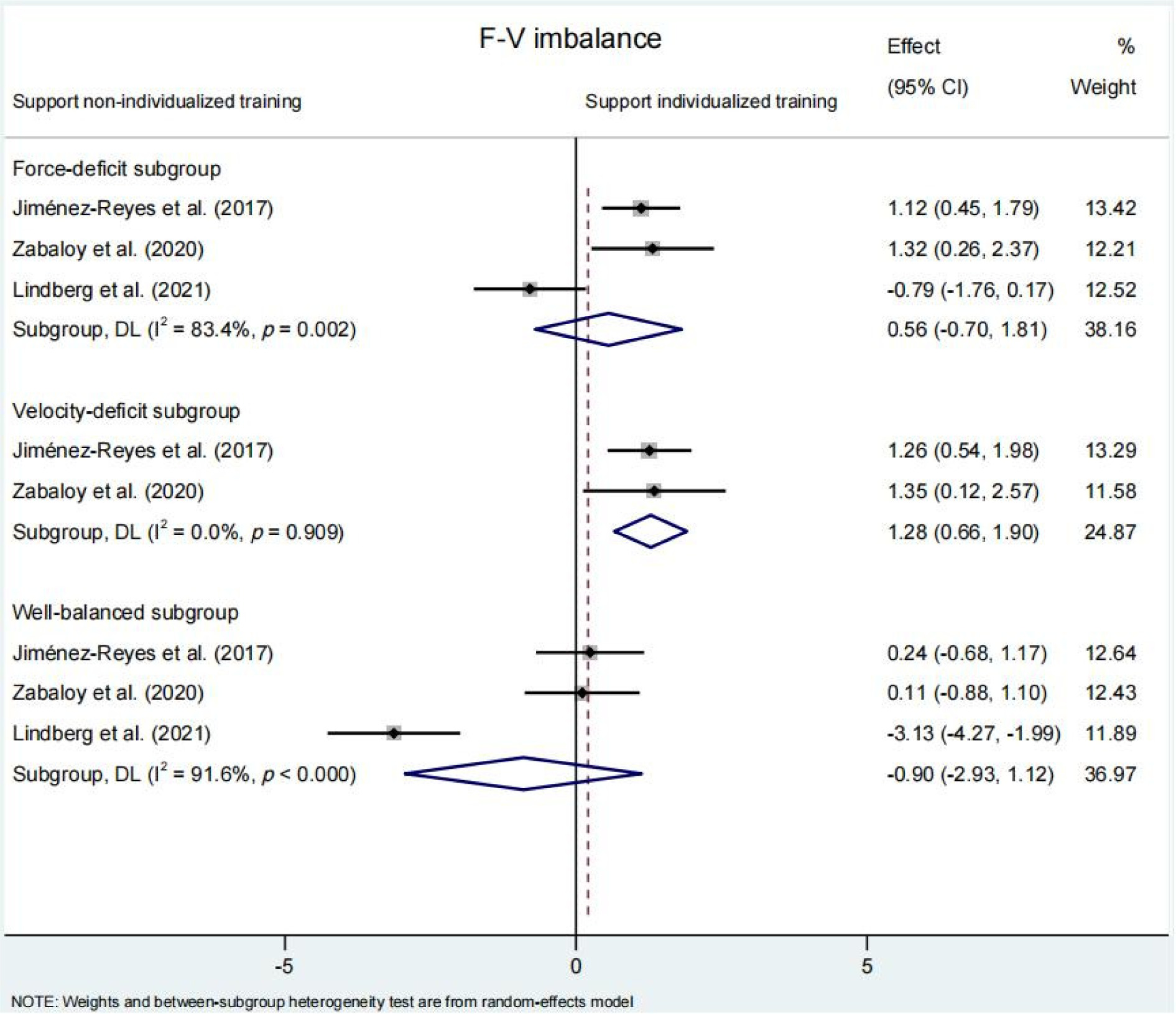 . Comparison of changes in the force-velocity (F-V) imbalance among three subgroups within the individualized training program based on the F-V profile (force-deficit, velocity-deficit, and well-balanced) compared to a non-individualized training program. Forest plot shows pooled standardised mean differences along with their 95% confidence intervals (CIs).