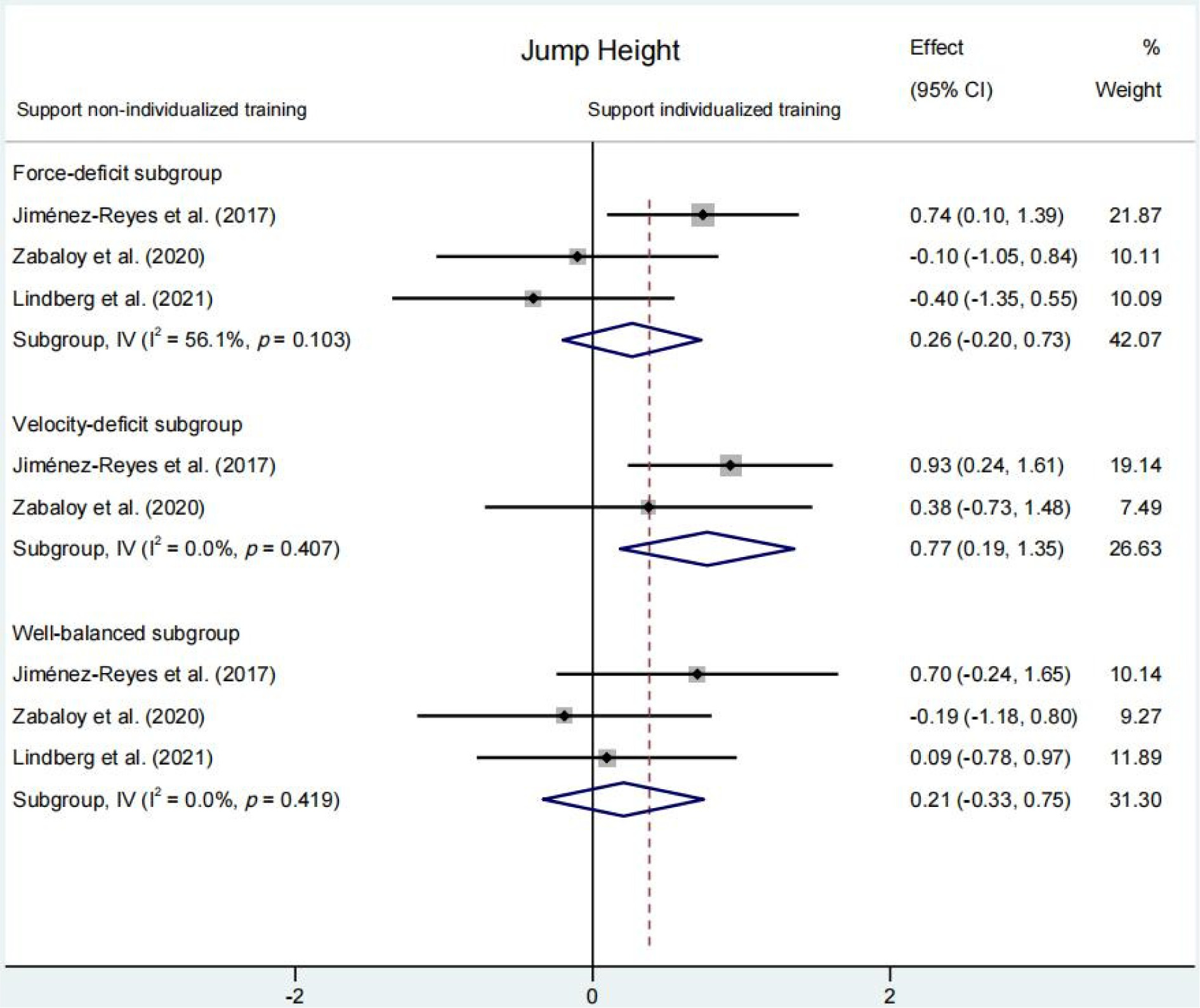 . Comparison of changes in jump height among three subgroups within the individualized training program based on the force-velocity profile (force-deficit, velocity-deficit, and well-balanced) compared to a non-individualized training program. Forest plot shows pooled standardised mean differences along with their 95% confidence intervals (CIs).