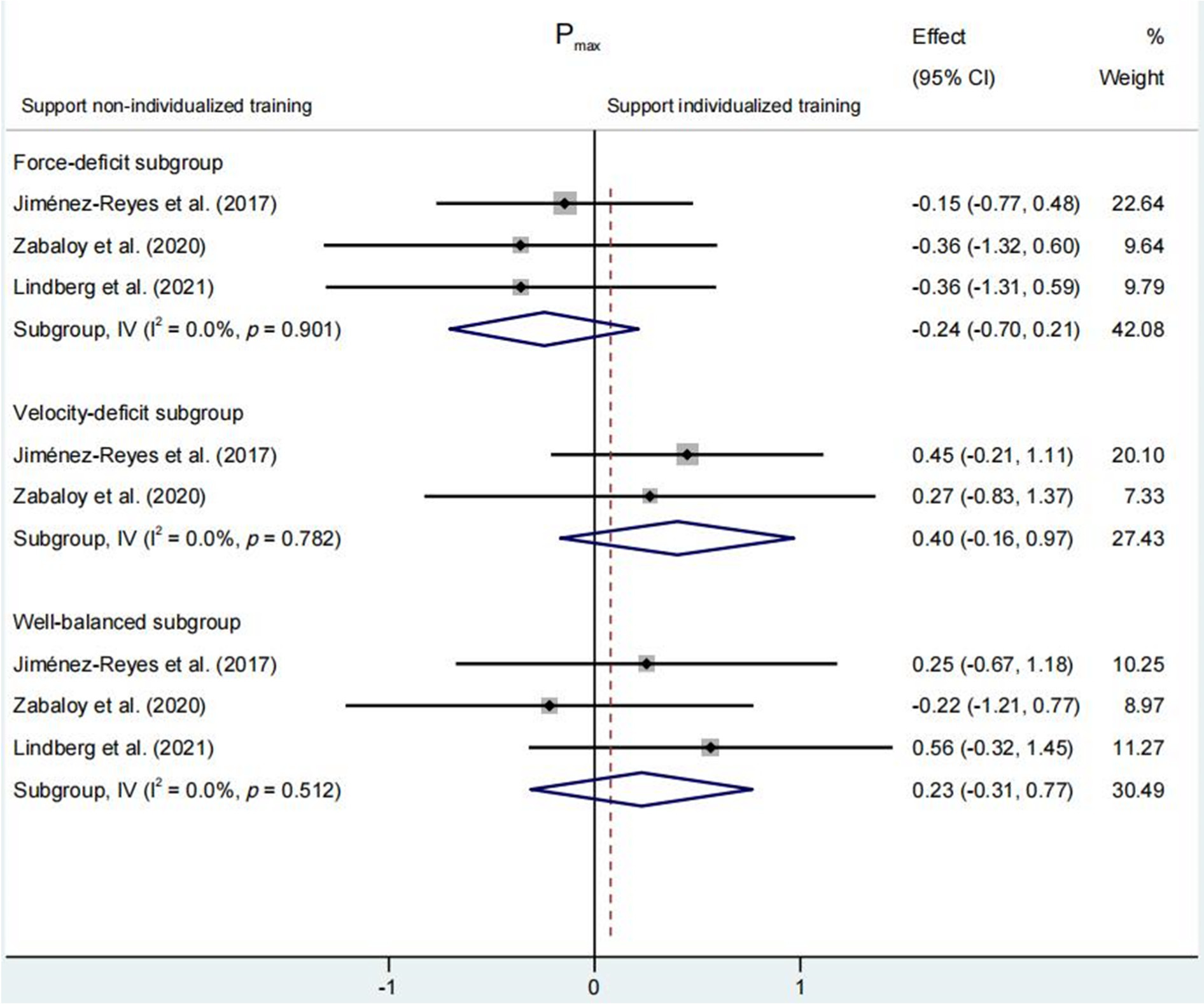. Comparison of changes in maximal power (Pmax) among three subgroups within the individualized training program based on the force-velocity profile (force-deficit, velocity-deficit, and well-balanced) compared to a non-individualized training program. The forest plot shows pooled standardised mean differences along with their 95% confidence intervals (CIs).