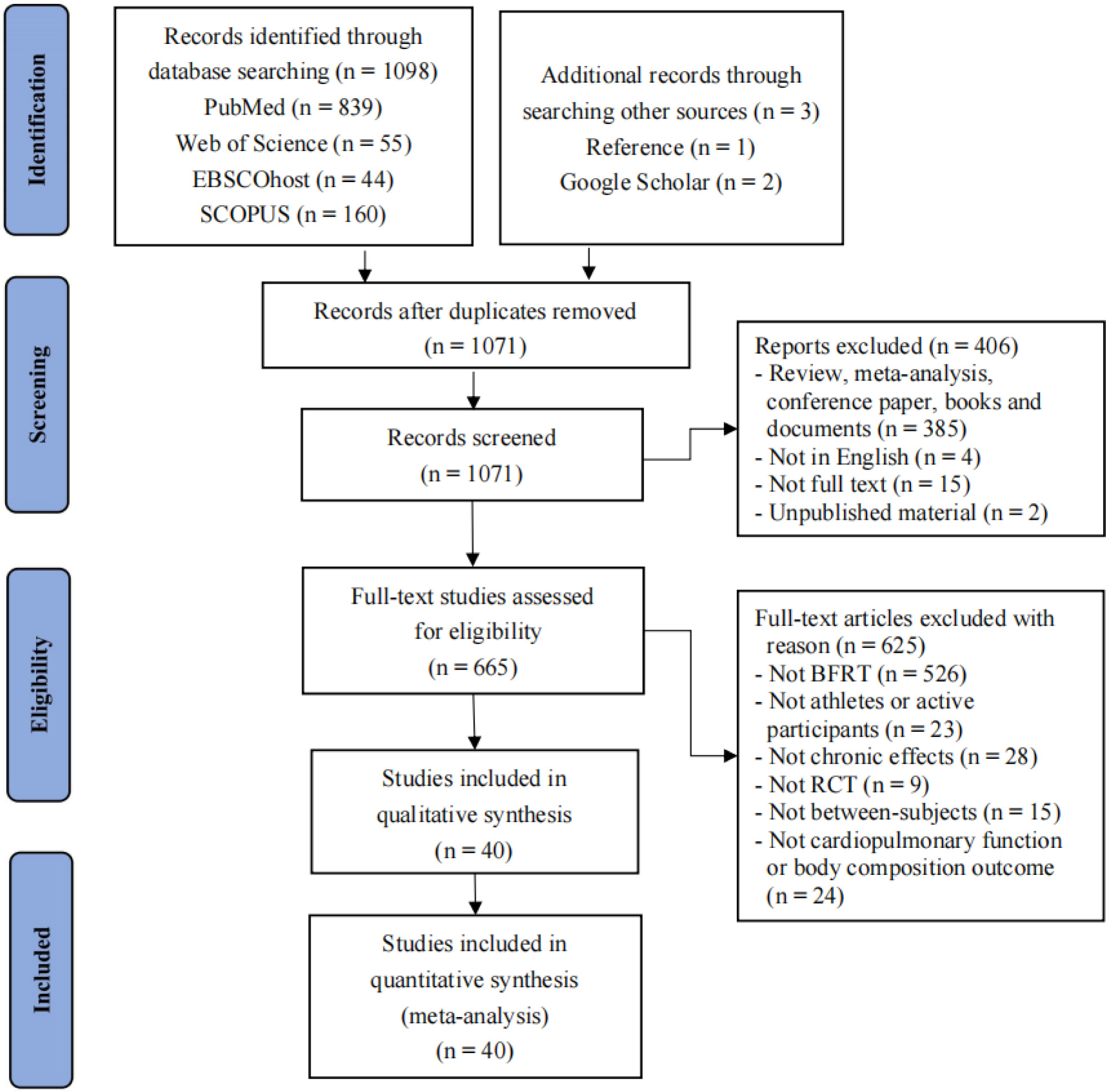 Notably, the application of BFRT presents certain health risks and limitations (Brandner et al., 2018). For instance, although BFRT is typically performed at low intensities (20–40% of 1RM or less than 50% of VO2max), cardiovascular stress induced by this training modality may pose potential risks for individuals with a high risk of cardiovascular disease (Patterson et al., 2019; Renzi et al., 2010). Therefore, this study exclusively includes healthy individuals as research participants. Furthermore, most previous systematic reviews have primarily focused on BFRT’s effects on muscle strength and hypertrophy, with less emphasis on its effects on cardiopulmonary function and body composition in athletes and active participants (Grønfeldt et al., 2020; Perera et al., 2022). Although the aerobic benefits of BFRT have been demonstrated, its effects on the cardiac function and body composition of athletes and active participants remain controversial. Therefore, this meta-analysis aimed to evaluate the effects of BFRT on cardiopulmonary function and body composition, as well as to examine potential moderators influencing training outcomes. This study could provide scientific support for optimizing BFRT methods and offer safe, efficient training options for populations with varying fitness levels.