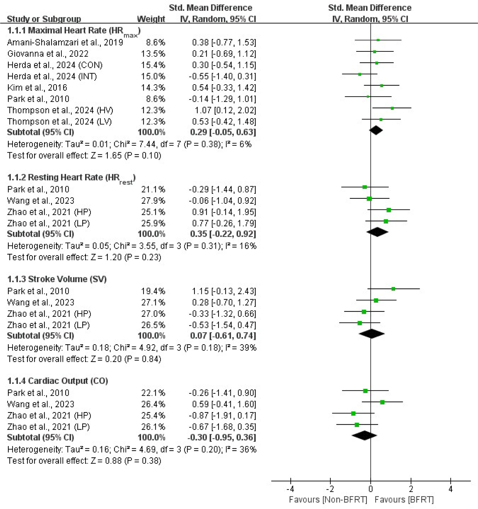 The meta-analysis of included studies showed no significant differences (p > 0.05) between BFRT and no-BFRT groups in HRmax (SMD = 0.29; 95% CI = −0.05–0.63), HRrest (SMD = 0.35; 95% CI = −0.22–0.92), SV (SMD = 0.07; 95% CI = −0.61–0.74), and CO (SMD = −0.30; 95% CI = −0.95–0.36). Additionally, the effects were homogeneous across studies (I2 = 6%–39%; p > 0.05).