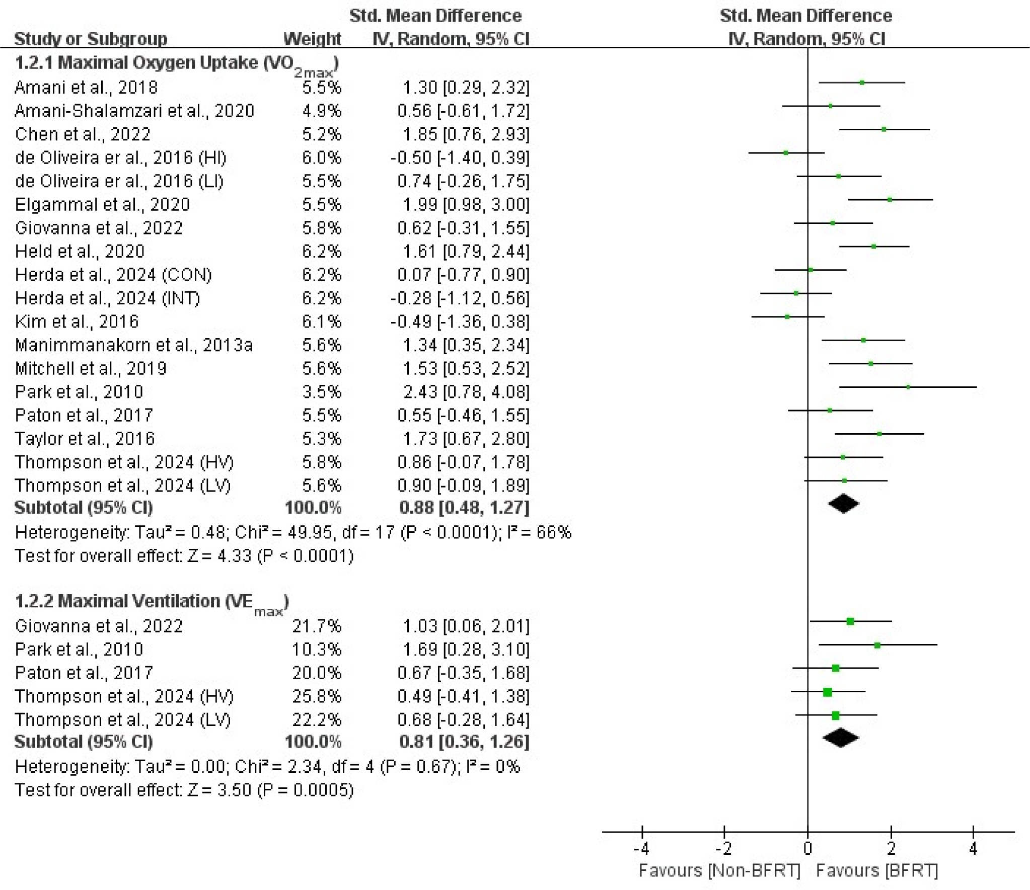 Meta-analysis results indicated that, compared to no-BFRT interventions, BFRT had a moderate and significant effect (p < 0.01) on VO2max (SMD = 0.88; 95% CI = 0.48–1.27) and VEmax (SMD = 0.81; 95% CI = 0.36–1.26). Moreover, VO2max exhibited moderate heterogeneity (I2 = 66%; p < 0.01), while VEmax showed no heterogeneity (I2 = 0%; p = 0.67).
