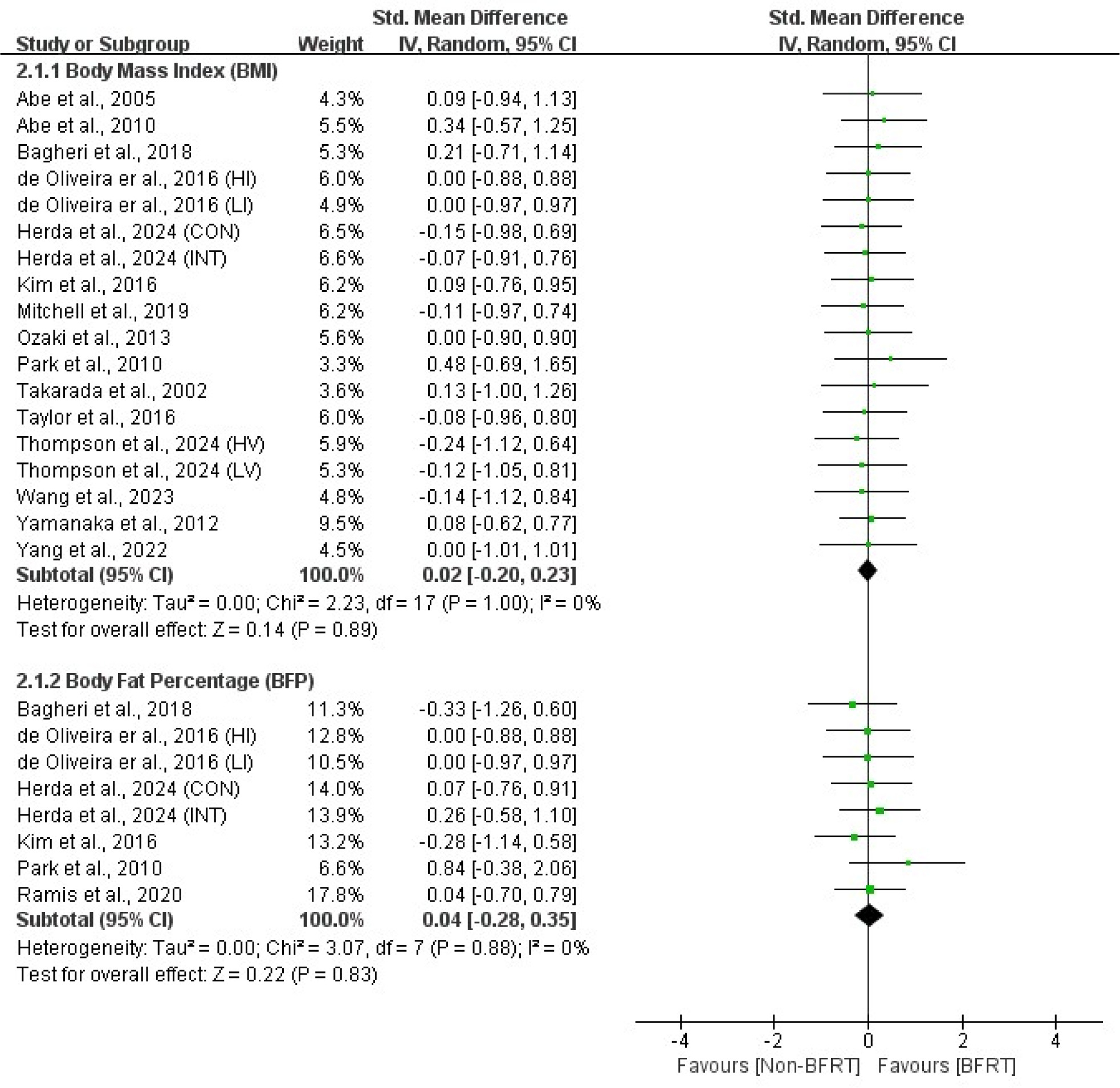 The meta-analysis results showed no significant differences (p > 0.05) between BFRT and non-BFRT regarding the BMI (SMD = 0.02; 95% CI = −0.20–0.23) and the BFP (SMD = 0.04; 95% CI = −0.28–0.35), with no heterogeneity observed (I2 = 0%; p > 0.05).