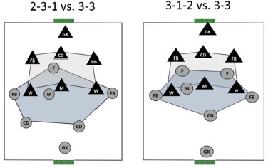 During SSGs, teams A and B implemented three different TFs to represent a tactical context where TFs 2-3-1 and 3-1-2 were always confronted with a 3-3 TF to have two different TFs playing versus a similar opposition (Figure 1).