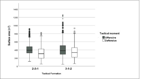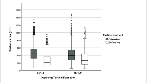 When building up an attack against a 2-3-1 TF, the offensive team exhibited lower team´s height but more team´s width and the stretch index than attacking against a 3-1-2 TF (Table 4). In addition, attacking against a 2-3-1 TF increased the team´s surface area in comparison with a defensive 3-1-2 structure (p < 0.001; ES = 0.241) (Figure 3).