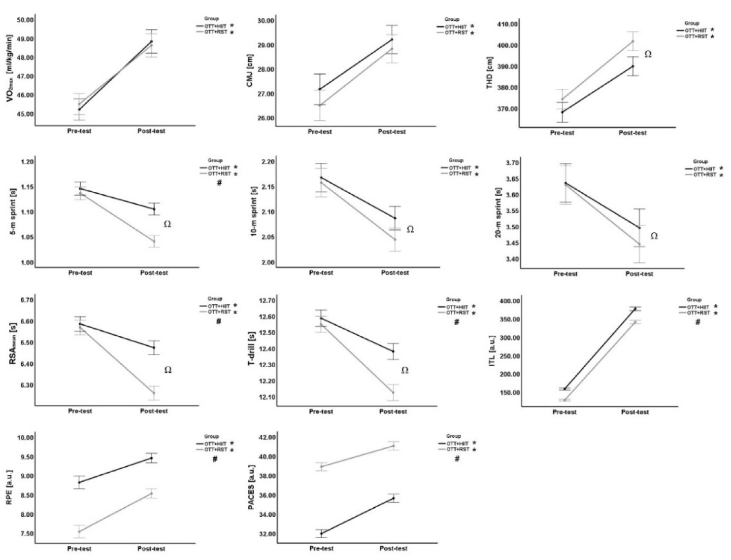 Table 1 shows the time and group effects and their respective interactions for all measured variables. All variables showed a significant improvement over time, with VO2max showing the greatest improvement with a strong effect size (F = 740.215, p < 0.001, η2 = 0.97). Although there was a non-significant group effect, VO2max was the only variable that increased significantly in the OTT + HIIT group. Regarding the group effect, only the 5-m sprint (F = 4.559, p = 0.044, η2 = 0.17), RSAmean (F = 6.215, p = 0.021, η2 = 0.22), and T-drill agility (F = 4.394, p = 0.048, η2 = 0.17) showed differences between groups (Table 1). However, the THD, 5-m sprint, 10-m sprint, 20-m sprint, RSAmean, and T-drill showed a significant time x group interaction. This indicates that changing the group (from OTT + HIIT to OTT + RST) significantly increases the rate of improvement in these variables.