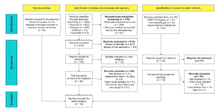 Figure 1 presents a flowchart (following the Preferred Reporting Items for Systematic Reviews and Meta-Analyses 2020 guidelines (PRISMA 2020)) depicting the processes of article screening and selection. As mentioned, we also searched the grey literature, which included preprint articles, conference abstracts, study register entries, clinical study reports, dissertations, unpublished manuscripts, government reports, and any other documents providing relevant information. Of the potentially eligible articles, 376 were excluded before screening because they were duplicate publications (309) or they did not have full-text availability (67). At the title-abstract stage of screening for eligibility (stage I), we excluded 491 and 83 articles on the basis of their titles and abstracts, respectively. Moreover, 23 articles could not be retrieved and were thus excluded. At the full-text stage of screening for eligibility (stage II), we excluded 64 RCTs because of the following reasons: 21 did not enroll athletes, 11 did not use a parallel design, 5 had intervention duration of <14 days (insufficient period for noticeable changes in outcomes), and 27 assessed outcome indicators not measured by any other study. Finally, 18 studies meeting the inclusion criteria were considered in our meta-analysis.