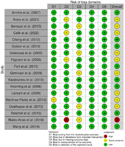 Regarding the outcome exercise performance, our risk-of-bias analysis indicated a low risk of bias for eight RCTs, some concerns for nine RCTs, and a high risk of bias for one RCT (Figure 2). Specifically, in domains 1–3, some concerns were noted for one, three, and six RCTs, respectively, because of factors such as nonrandomized group assignment, a single-blind study design, intragroup differences in exercise, and participant attrition. All 18 RCTs had a low risk of bias in the outcome measurement and result selection domains. Because the assessors were blinded in all RCTs, the studies were considered to have a low risk of detection bias. Studies that reported unadjusted, raw data for outcomes were regarded as having a low risk of reporting bias.