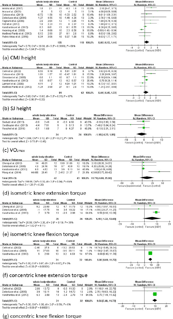 The GRADE results are presented in Appendix 5. Overall, the quality of evidence supporting the positive effects of WBV on VO2max, isometric torque of the knee flexors, and concentric torque of the knee extensors and flexors was low. Moreover, the quality of evidence supporting the positive effects of WBV on CMJ height, SJ height, and isometric torque of the knee extensors was very low.