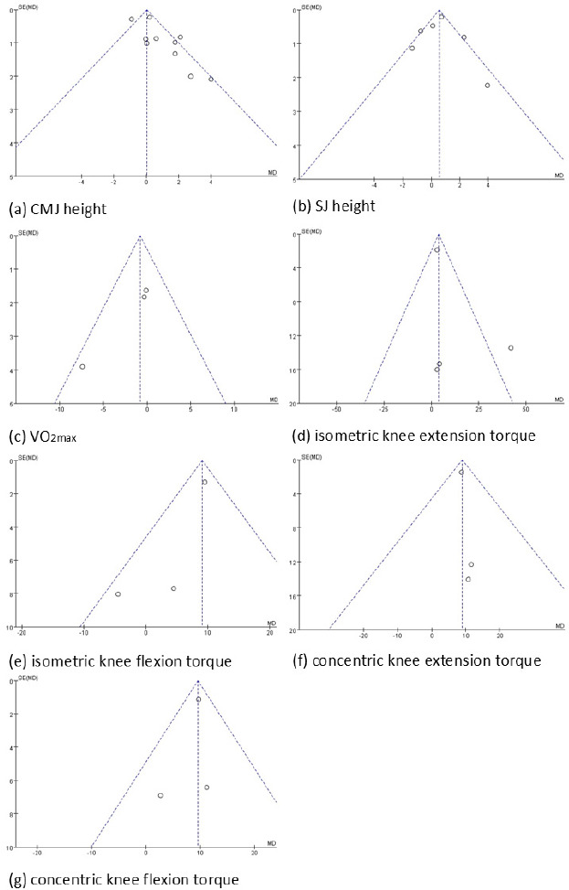 Funnel plots for the seven indicators used in this study are presented in Figure 4. No significant heterogeneity was observed for VO2max, concentric torque of the knee extensors or flexors, or isometric torque of the knee flexors. However, for the two indicators of power (CMJ height and SJ height) and one indicator of strength (isometric torque of the knee extensors), some heterogeneity was observed, with distribution beyond the two diagonal lines (Song et al., 2002).