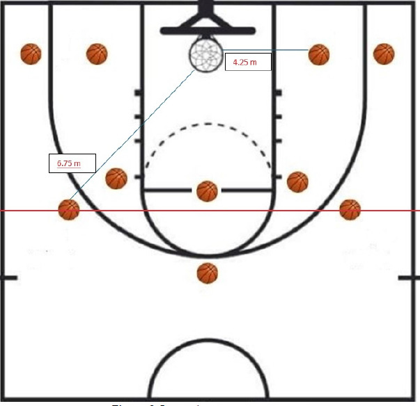 Jump shooting accuracy was assessed via a standardized test involving 20 jump shots from 10 predetermined zones on the basketball court, as illustrated in Figure 2. Five shooting zones were positioned at a distance of 4.25 m and five at 6.75 m from the basket, covering both 2-point and 3-point attempts. Each shot was scored using a predefined accuracy rubric: 2 points for a made shot, 1 point for the rim contact, 0 for a miss. The total score from each trial was averaged across three rounds to yield the final JSA performance value. Players were instructed to maintain game-intensity pace to simulate real-match shooting contexts.