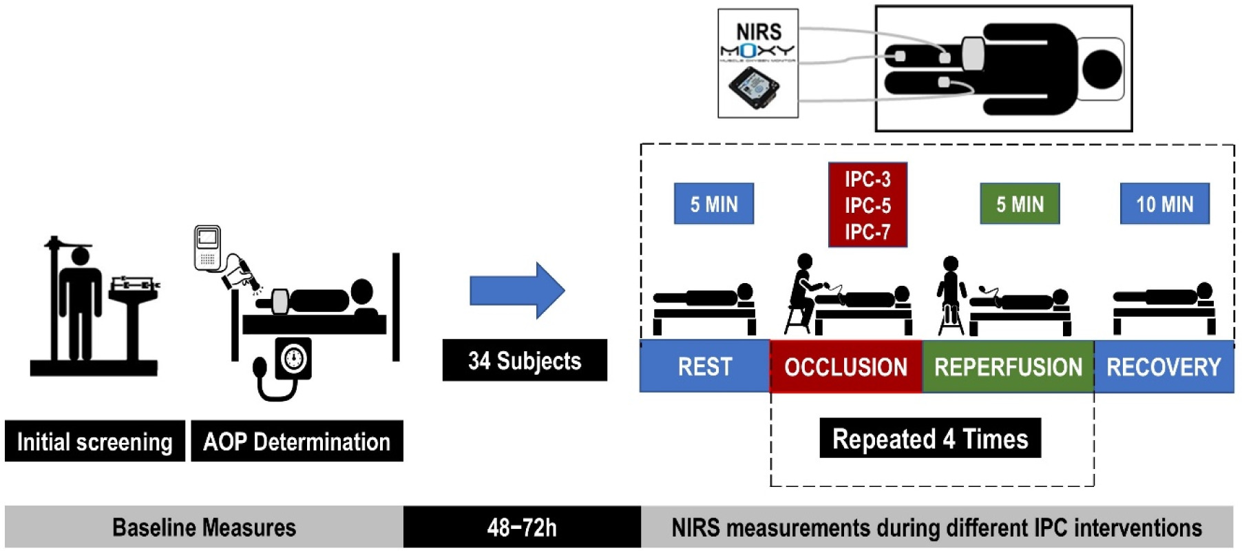 After the recruitment of participants, by E-mail, phone or personally, the first laboratory visit included anthropometric measurements (body height, body mass, circumferences, skinfold thickness) and screening questionnaires. Following a 5-min rest interval in a supine position, systolic (SBP) and diastolic (DBP) arterial blood pressures were measured. Following an additional 10-min rest interval, arterial occlusion pressure (AOP) was measured. At the second laboratory visit, using a randomized parallel-participant design, participants were allocated into one of the three IPC protocol conditions: IPC-3, IPC-5 or IPC-7. Randomization was conducted via a random number sequence generated online (www.randomization.com). Local oxygen saturation (SmO2) was measured using three portable NIRS sensors under a resting condition. Measurements were taken before, during, and after the IPC protocols.