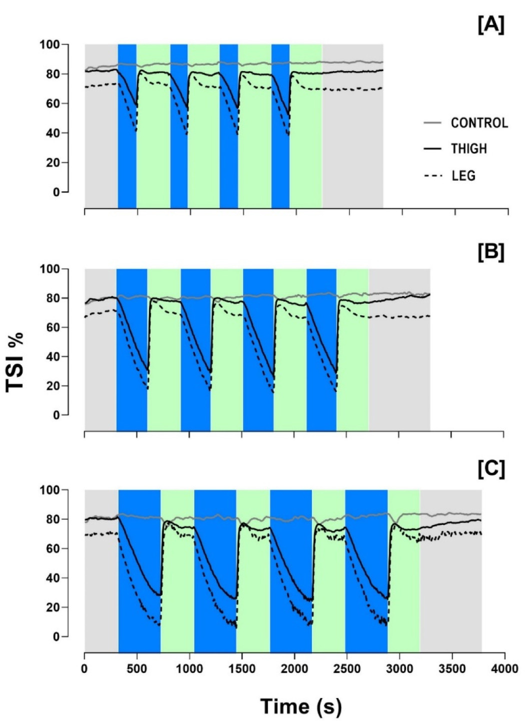 Tissue saturation index values (expressed as a percentage, TSI%) measured with NIRS sensors in non-occluded (Control) and occluded (Thigh and Leg) limbs are depicted in [A] for IPC-3, [B] for IPC-5 and [C] for IPC-7. Gray areas indicate baseline and recovery sections; blue areas represent occlusion phases; green areas represent reperfusion phases.
