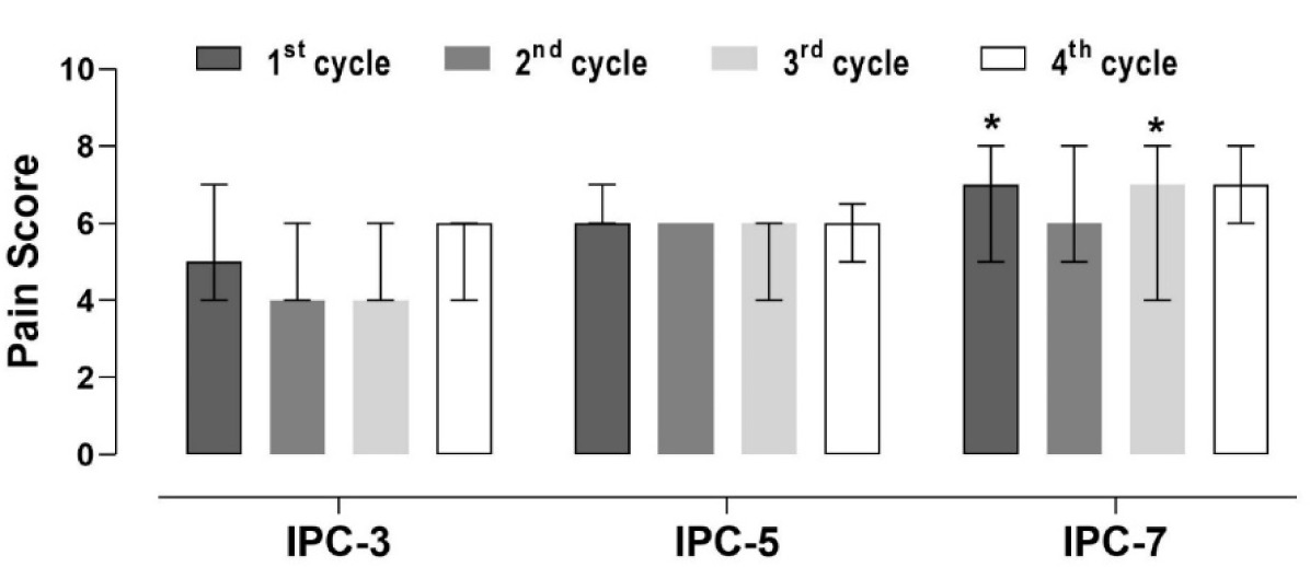 Pain perception throughout the IPC application was higher in IPC-7 after the first and third cuff occlusion cycles compared to IPC-3 (Figure 3). No other significant differences in pain perception were found among IPC protocols (p > 0.05).