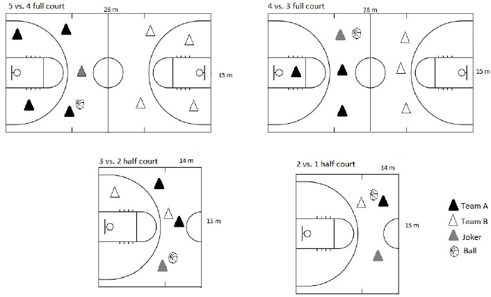 In total, 13 games were played with nine SSG formats with numerical equality, superiority, and inferiority, in two different court sizes (a full and a half court). Games in the full court (FC) playing area (28 x 15 m) were: numerical equality (5 vs. 5, 3 vs. 3, 4 vs. 4), superiority and inferiority (4 vs. 3, 5 vs. 4). Games in the half court (HC) playing area (15 x 14 m) were: numerical equality (3 vs. 3, 2 vs. 2), superiority and inferiority (3 vs. 2, 2 vs. 1). Players were evaluated individually by two experts, in a total of 76 individual observations.