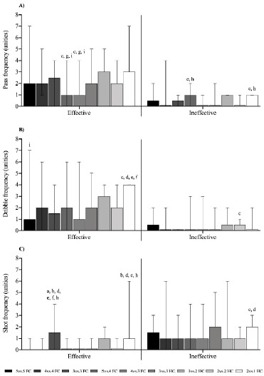 Figure 3 shows the efficacy of the technical-tactical actions of passing, dribbling, and shooting analyzed using the GPAI. Pass efficacy was significantly higher (p < 0.05) in 5 vs. 4 FC and 4 vs. 3 FC SSGs compared to 3 vs. 3 FC, 3 vs. 2 HC, and 2 vs. 1 HC SSGs, while pass inefficacy was significantly higher (p < 0.05) in 5 vs. 4 FC and 2 vs. 1 HC SSGs compared to 4 vs. 3 HC and 2 vs. 1 HC SSGs (Figure 3A). Dribble efficacy was significantly higher (p < 0.05) in the 2 vs. 1 HC compared to the 3 vs. 3 FC, 5 vs. 4 FC, 4 vs. 3 FC, and 3 vs. 3 HC formats, whereas dribble inefficacy was higher (p < 0.05) in the 2 vs. 2 HC format compared to the 3 vs. 3 FC format (Figure 3B). The 3 vs. 3 FC format showed greater (p < 0.05) shot efficacy compared to the 5 vs. 5 FC, 4 vs. 4 FC, 5 vs. 4 FC, 4 vs. 3 FC, 3 vs. 3 HC and 2 vs. 2 HC formats. The 2 vs. 1 HC format also showed higher shot efficacy (p < 0.05) compared to the 4 vs. 4 FC, 5 vs. 4 FC, 4 vs. 3 FC, and 2 vs. 2 HC formats. Shot inefficacy was higher (p < 0.05) in the 2 vs. 1 HC format in comparison to the 3 vs. 3 FC and 5 vs. 4 FC formats (Figure 3C).
