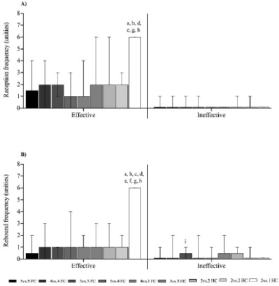 Figure 4 shows the efficacy of the technical-tactical actions of reception and rebound analyzed using the GPAI. Reception efficacy was significantly higher (p < 0.05) in the 2 vs. 1 HC format compared to the 5 vs. 5 FC, 4 vs. 4 FC, 5 vs. 4 FC, 4 vs. 3 FC, 3 vs. 2 HC, and 2 vs. 2 HC formats. No differences (p > 0.05) were found in reception inefficacy (Figure 4A). Rebound efficacy was significantly higher (p < 0.05) in the 2 vs. 1 HC compared to all other game formats, while rebound inefficacy was higher (p < 0.05) in the 3 vs. 3 FC compared to the 2 vs. 1 HC format (Figure 4B).