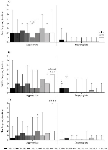 Analyzing appropriateness, the 2 vs. 1 HC format exhibited significantly higher appropriate dribble and shot frequencies, although it also displayed significantly more inappropriate passes. Conversely, the 4 vs. 3 format demonstrated a significantly higher pass frequency.