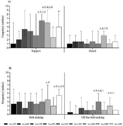 Figure 6 shows the defensive and offensive technical-tactical actions with and without the ball included in the GPAI. The 3 vs. 3 HC format presented significantly higher support values (p < 0.05) compared to the 5 vs. 5 FC, 4 vs. 4 FC, 4 vs. 3 FC, and 2 vs. 2 HC formats. Similarly, the 3 vs. 2 HC format showed higher support values (p < 0.05) compared to the 5 vs. 5 FC, 4 vs. 4 FC, 5 vs. 4 FC, 4 vs. 3. FC, and 2 vs. 2 HC formats. The 2 vs. 1 HC format showed higher support values (p < 0.05) in comparison to the 2 vs. 2 HC format (Figure 6A). There were also significantly higher guarding values (p < 0.05) in the 3 vs. 2 HC format compared to the 5 vs. 5 FC, 5 vs. 4 FC, 3 vs. 3 HC, and 2 vs. 2 HC formats (Figure 6A). Ball marking was significantly higher (p < 0.05) in the 3 vs. 2 HC format compared to 3 vs. 3 FC and 2 vs. 2 HC formats. Similarly, the 2 vs. 1 HC format showed higher (p < 0.05) ball marking than 5 vs. 5 FC, 4 vs. 4 FC, 3 vs. 3 FC, 4 vs. 3 FC, and 2 vs. 2 HC formats (Figure 6B). Off-the-ball marking was significantly greater (p < 0.05) in the 3 vs. 3 HC compared to the 5 vs. 5 FC, 4 vs. 4 FC, 4 vs. 3 FC, 3 vs. 2 HC, and 2 vs. 1 HC formats. Similarly, off-the-ball marking was higher in the 2 vs. 2 HC (p < 0.05) compared to 5 vs. 5 FC, 4 vs. 4 FC, and 4 vs. 3 FC formats (Figure 6B).
