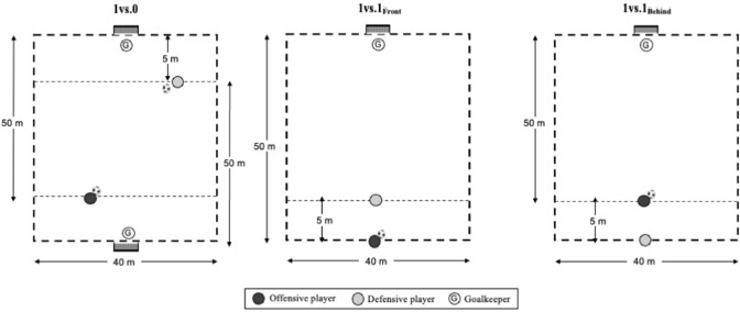 The tasks commenced upon the coach's signal. Following the initial movement, if the goal was achieved or the play concluded (due to the goalkeeper's save or the ball going out of play), all players rested while new teammates initiated the game. However, during the 1 vs. 1 scenario, if defensive players intercepted the ball, they were required to swiftly launch an attack towards the opposing goal. Regardless of the outcome of the subsequent play, participants were instructed to rest, and a new set of teammates would start after a new signal from the coach. Similarly, in any of the aforementioned instances, if players in possession of the ball failed to execute a rapid counter-attack, resulting in a positional play, coaches would terminate the play, allowing new players to take over. This sequence repeated alternately between the teams throughout the entire duration of the task. Initially, teams were assigned roles (offensive or defensive), and upon the participation of all players, these roles were exchanged. In the 1 vs. 0 format, both teams attacked different goals, and players commenced each attack following the coach's signal.