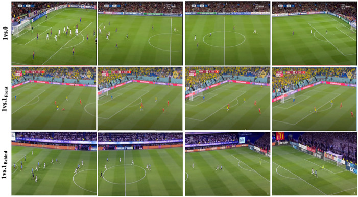 Data were collected during the latter part of the 2022–2023 season, when training loads of TGs were monitored over a span of 6 weeks. These specific TGs were selected by two highly experienced professional coaches with expertise in analyzing different match situations, particularly focused on counter-attacks and transitions in soccer matches. TGs under scrutiny are illustrated in Figure 1. Building on prior research (Asian-Clemente et al., 2022, 2023a, 2023b, 2024), two teams, each comprising nine players, engaged in transition plays to score goals across three realistic scenarios of counter-attacks (Figure 2). Every week, soccer players took part in a distinct TG, each of which was repeated twice. These TGs presented varying levels of the opposition. One was structured solely with the opposition of a goalkeeper (1 vs. 0), while the others involved both a goalkeeper and one defender, who adjusted their starting positions: either in front of (1 vs. 1Front) or behind (1 vs. 1Behind) the attackers. Regardless of the TG's format, the objective remained consistent: offensive players aimed to attack the opponents' goal to score, while defenders and goalkeepers tried to prevent them from scoring.
