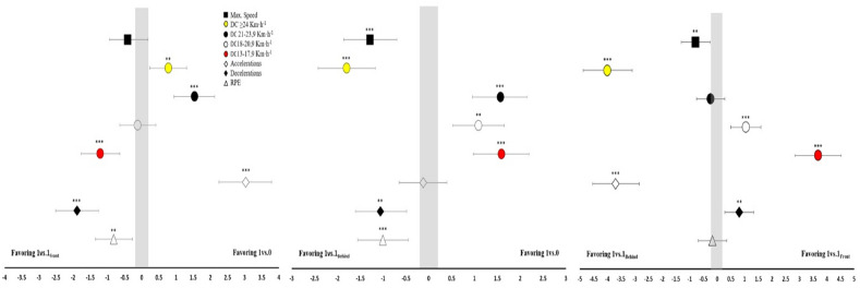 Notes: Difference scores (95% confidence intervals) among the three transition drills. Max Speed: Maximal speed attained during the drill; DC: Distance Covered; Accelerations and Decelerations are presented as the number of actions performed above 2.5 m•s−2 and below −2.5 m•s−2; RPE: Rate of Perceived Exertion; p-values are indicated as: *: p < 0.05; **: p < 0.01 and ***: p < 0.001
