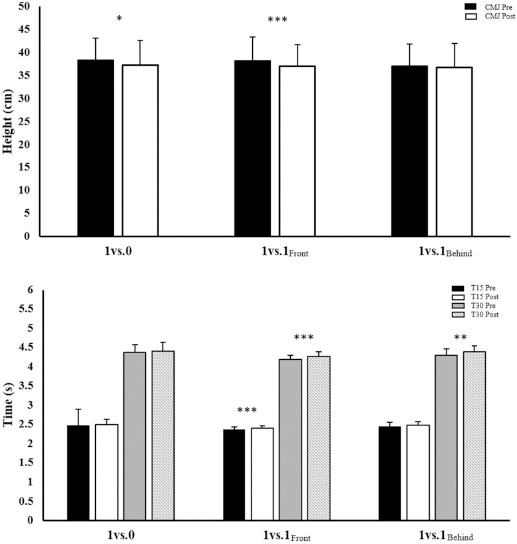 Notes: Changes in CMJ height and sprint time prior and after each transition game. Data are mean ± SD. T15: time for the 15-m sprint line test; T30: time for the 30-m sprint line test; CMJ: Counter-Movement Jump; p-values are indicated as: *: p < 0.05; **: p < 0.01 and ***: p < 0.001