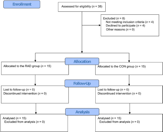 Out of the 38 potential participants, 30 met the inclusion criteria and were included in the study. All enrolled participants successfully completed the study and were included in the analysis (Figure 2). Table 1 shows no statistically significant differences between the RAD and CON groups within age and anthropometric variables. However, there were significant differences between the groups regarding functional outcomes. The RAD group had an ODI of 44.27 (SD 5.44) and a mean pain level of 5.27 (SD 1.10), while the CON group had an ODI of 10.27 (SD 5.34) and a mean pain level of 0.40 (SD 0.74).