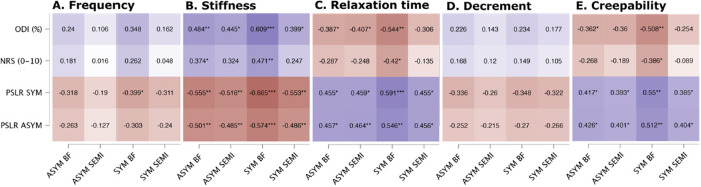 Figure 3 illustrates the correlation heatmap between the functional outcome and the myometric muscle variables. Significant correlations were observed for both the symptomatic and asymptomatic sides, particularly in hamstrings stiffness (ranging from −0.66 to 0.37), relaxation time (ranging from −0.59 to 0.42), and creepability (ranging from −0.55 to 0.36). Regarding stiffness, higher values were associated with higher scores on the ODI and NPRS, as well as lower scores on the PSLR test. Conversely, lower values in relaxation time or creepability corresponded to higher ODI and NPRS scores and lower PSLR test scores.