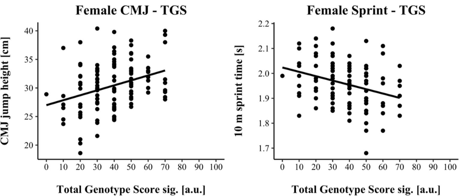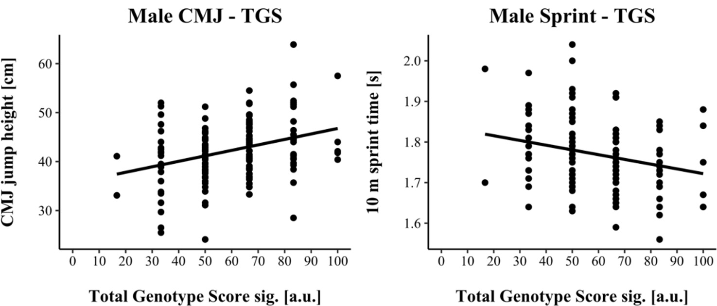 TGSsig ranged from 16.67 to 100.0 a.u. (including three SNPs: AGT, VDR & IP6K3) in male and from 0.00 to 70.0 a.u. (including five SNPs: ACTN3, AGT, HSD17B14, MTRR & UCP2) in female athletes. TGSsig showed a significant correlation with the CMJ and sprint performance in males (CMJ r = 0.328, p < 0.001; 10-m sprint r = −0.241, p = 0.004) as well as in females (CMJ r = 0.320, p < 0.001; 10-m sprint r = −0.320, p < 0.001) indicating a moderate correlation (Cohen, 1988).